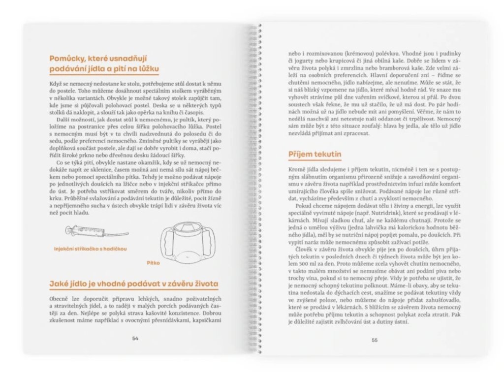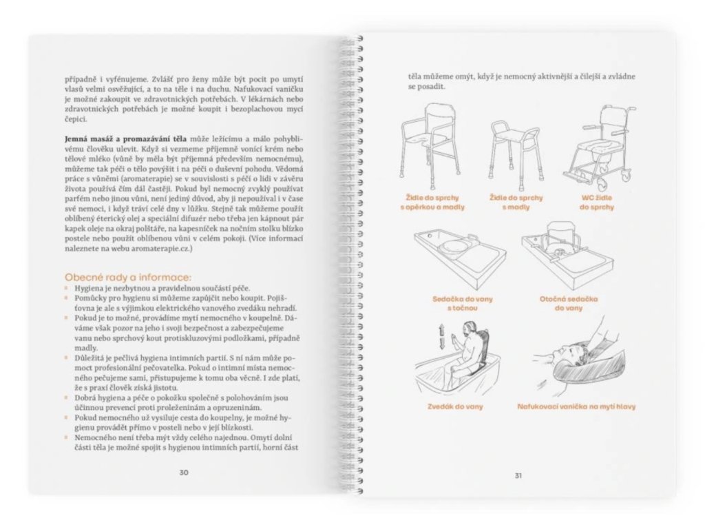 Je zaměřená na jednotlivé praktické oblasti péče o člověka v závěru života, např. jak zajistit hygienu u imobilního člověka, najdete zde tipy a triky při vyprazdňování na lůžku, rady pro přesuny nemocného z lůžka na vozík či toaletu. Ale také rady, jak můžete u nemocného podpořit pohyb nebo co může pomoct, či naopak uškodit při podávání potravy a tekutin. To vše včetně praktických návodů, konkrétních doporučení, tipů a rad pro nejen laické pečující.