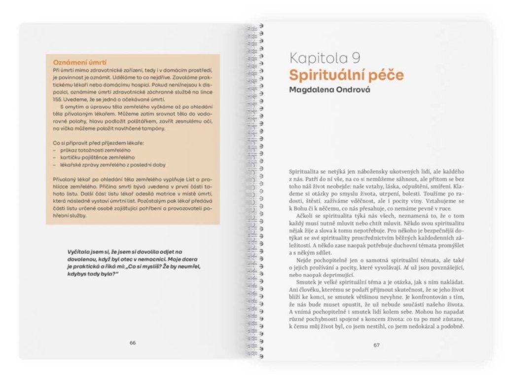 Kniha se nevyhýbá ani dilematům a rozhodování ve chvíli, kdy péče doma už není z různých důvodů možná, komunikaci s nemocným v závěru života a sebepéči u pečující rodiny. Kapitolu věnovanou spirituální péči napsala kaplanka Cesty domů Magdalena Ondrová.